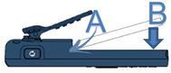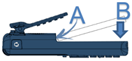 Akku einlegen: · Positionieren Sie die Akkuanschlüsse seitlich (wie in der Abbildung gezeigt) (A). · Schließen Sie die Installation des Akkus ab, indem Sie ihn wie in der Abbildung gezeigt in das Akkufach drücken (B). |