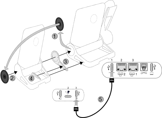 将提供的话机软线插入您装置和附加模块后面的专用插座 (USB-C 转 USB-C 电缆,