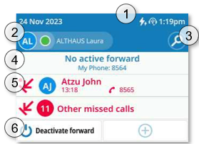 电话状态和号码将显示。 当您的话机无法接通时(立即转移或'免打扰'),此区域将显示为红色。